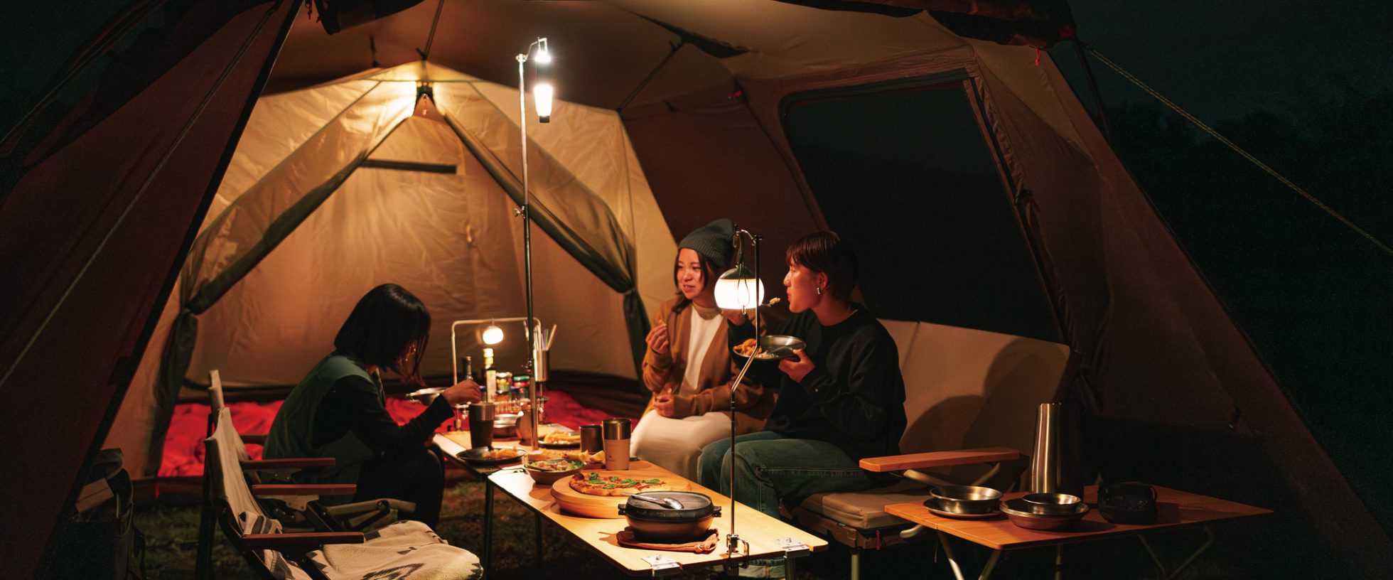 大切な家族や仲間との会話は、それを彩る風情のある明かりや食事で、より一層深いキャンプの思い出を作り出します。